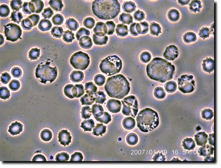 This series of images from a blood sample were taken from just one slide over a period of 5 hours with the SeeNano Lab and an AMP CCD-camera. By focusing through the layers of blood, both the surface and the insides of the blood cells can be seen.